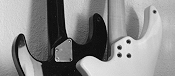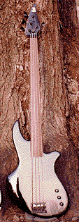 The "Lens" body shape was inspired by the Zeta Systems "Mirror 6" guitar and "Prism 4" bass. (Paul Guy Guitars has no connection with this company.) This is a futuristic but very comfortable and ergonomic shape which balances well both on a strap and in the lap, and allows unlimited access to the highest frets. I make this body in two sizes. Basses and baritones use the full size version. Guitars usually use the 7/8 size, but can be optionally ordered with the full size body. The picture above shows a Lens GR guitar, a Lens Baritone guitar, and a fretless Lens Bass. All three instruments have alder bodies and maple necks. The guitar has an ebony fingerboard while the baritone and bass have rosewood boards. The Lens GR guitar has Sperzel locking tuners, a Fender American Standard vibrato, and four handmade Kent Armstrong S/S Strat Standard (humbucking) pickups. Two of these are in a standard humbucker-size case at the bridge. A toggle switch connects the fourth pickup (the second of the pair in the humbucker case) in series with whatever pickup/ s are selected by the 5-way switch. It also has built-in Roland-authorised synth/V-Guitar driver electronics with the appropriate controls: synth volume, guitar/mix/synth selector, and remote "S1/S2" switches. The Lens Baritone has a 27" scale length, Sperzel locking tuners, and a Kahler Original vibrato (with bass springs). It has three Sky STV-1 single-coil pickups which are controlled by a 5-way switch plus a 3-way mini-toggle which provides series connections of the neck and middle or middle and neck pickups. It also has a built-in Roger Mayer-designed Guy RM-1 preamp with a true bypass switch. The controls are volume, tone (midrange filter) and preamp gain (unity - +15dB).