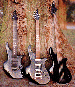 The "Lens" body shape was inspired by the Zeta Systems "Mirror 6" guitar and "Prism 4" bass. (Paul Guy Guitars has no connection with this company.) This is a futuristic but very comfortable and ergonomic shape which balances well both on a strap and in the lap, and allows unlimited access to the highest frets. I make this body in two sizes. Basses and baritones use the full size version. Guitars usually use the 7/8 size, but can be optionally ordered with the full size body. The picture above shows a Lens GR guitar, a Lens Baritone guitar, and a fretless Lens Bass. All three instruments have alder bodies and maple necks. The guitar has an ebony fingerboard while the baritone and bass have rosewood boards. The Lens GR guitar has Sperzel locking tuners, a Fender American Standard vibrato, and four handmade Kent Armstrong S/S Strat Standard (humbucking) pickups. Two of these are in a standard humbucker-size case at the bridge. A toggle switch connects the fourth pickup (the second of the pair in the humbucker case) in series with whatever pickup/ s are selected by the 5-way switch. It also has built-in Roland-authorised synth/V-Guitar driver electronics with the appropriate controls: synth volume, guitar/mix/synth selector, and remote "S1/S2" switches. The Lens Baritone has a 27" scale length, Sperzel locking tuners, and a Kahler Original vibrato (with bass springs). It has three Sky STV-1 single-coil pickups which are controlled by a 5-way switch plus a 3-way mini-toggle which provides series connections of the neck and middle or middle and neck pickups. It also has a built-in Roger Mayer-designed Guy RM-1 preamp with a true bypass switch. The controls are volume, tone (midrange filter) and preamp gain (unity - +15dB).